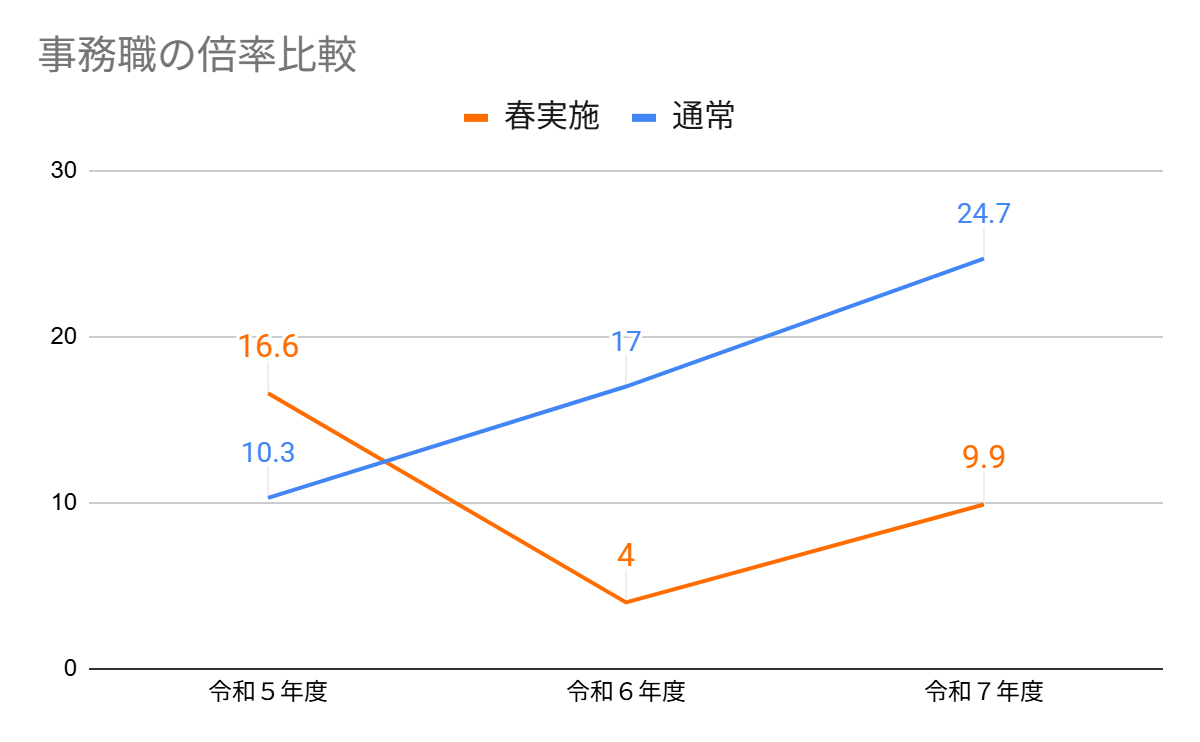 なお、令和7年度に倍率が跳ね上がりました。これは、公務員の社会人採用全体の人気過熱が原因です。
